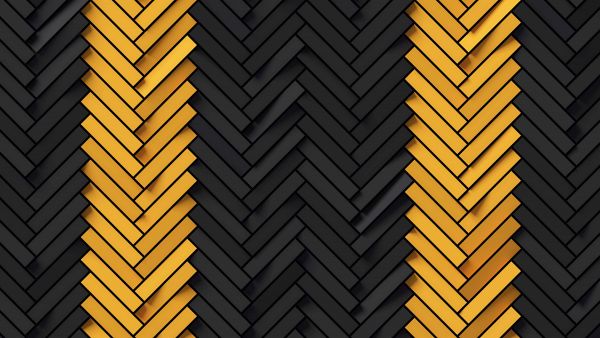 Carta da parati 3D a spina di pesce in giallo e nero. L'effetto 3D fa sembrare che la spina di pesce esca dal muro.