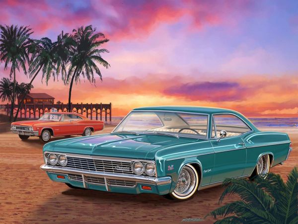 Questo design combina il fascino senza tempo delle auto americane classiche con l'atmosfera rilassata di una spiaggia tropicale. In primo piano c'è una Chevrolet Super Sport turchese, perfettamente mantenuta con vernice lucida, dettagli cromati e finiture eleganti sui cerchi. Sullo sfondo si staglia una Chevrolet rossa, che contrasta armoniosamente con le calde tonalità del tramonto. L'ambientazione cattura l'essenza di una serata estiva, completa di palme ondeggianti e un molo che si protende elegantemente nell'oceano. Il cielo è riempito con vivaci sfumature di rosa, viola e arancione, creando un'atmosfera serena e nostalgica. I riflessi del sole al tramonto sulle auto e sulla sabbia aggiungono ulteriore profondità e scintillio a questo design. Questa immagine è ideale per gli amanti delle auto classiche e dei paesaggi tropicali, portando un senso di tranquillità e raffinatezza in ogni spazio. Si adatta perfettamente a interni con un tema retro, moderno o costiero. Combina il design con mobili chiari, materiali naturali e accessori come modellini di auto o poster vintage per completare l'atmosfera. La Chevrolet Super Sport, con le sue linee iconiche e dettagli perfetti, forma il cuore di questa scena estiva e richiama ricordi di spensierate passeggiate lungo la costa. Un'immagine che emana calore, nostalgia e classe senza tempo!