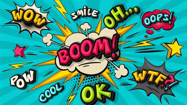 Questo design vivace vi porta nel mondo dei fumetti classici, con onomatopee accattivanti come "BOOM!", "WOW!" e "OOPS!" visualizzate su uno sfondo turchese strutturato. I colori allegri e la tipografia giocosa creano un'energia potente e giovanile.