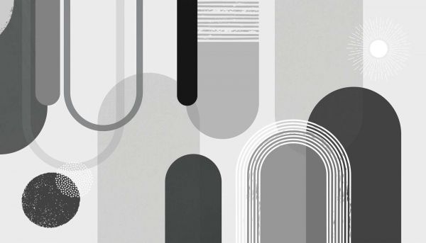 Un'interpretazione astratta di luce e ombra, che combina toni morbidi di grigio e nero in diverse forme e texture. I dettagli luminosi e l'elemento a raggiera danno un'illusione di profondità e movimento.