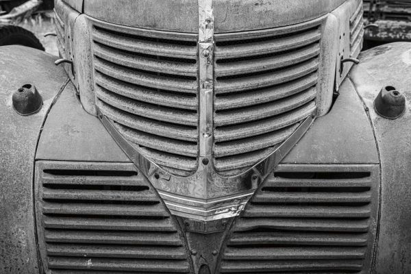 Immagine in bianco e nero di un dettaglio ravvicinato di una griglia d'auto classica e logora, con una simmetria evidente e lamelle orizzontali arrugginite. L'immagine trasmette nostalgia industriale e potenza meccanica, accentuata dal contrasto tra le texture metalliche e l'usura.