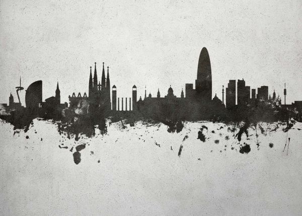 Uno skyline ad acquerello di Barcellona in stile urbano. Lo skyline è disponibile con diversi sfondi.