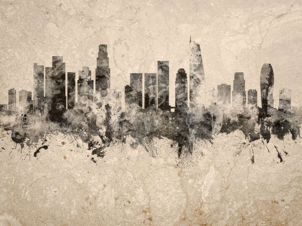 Uno skyline ad acquerello di Los Angeles in stile urbano. Lo skyline è disponibile con diversi sfondi.