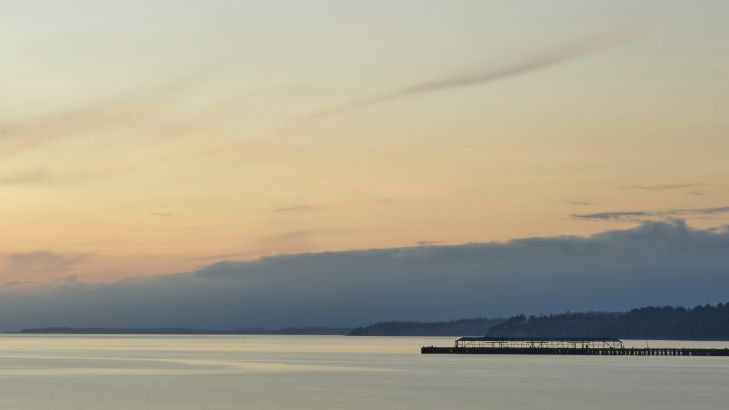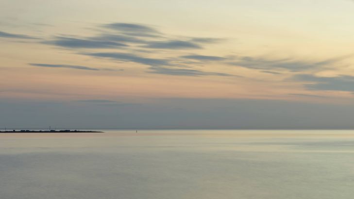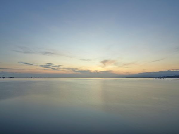 L'alba sulla costa. Immagine dettagliata di un sorgere del sole sopra l'acqua