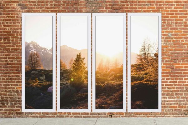L'immagine è suddivisa in quattro pannelli alti, creando ritmo e un'impressionante presenza verticale. Questo design si adatta perfettamente a interni moderni, industriali o rustici. In uno spazio industriale – pensa a muri di mattoni, acciaio e cemento – questo design aggiunge calore e un contrasto naturale. In uno stile chalet o rurale, il legame con la vita all'aperto emerge ancora più forte.