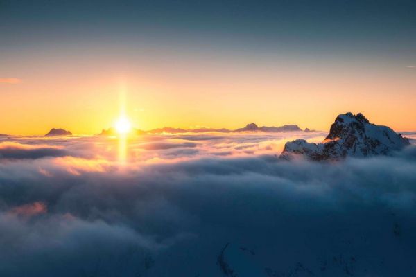 Un momento magico in cui il sole sorge sopra un vasto mare di nuvole, con cime innevate che si ergono come isole dalla nebbia. Luce dorata e tonalità pastello riempiono il cielo.