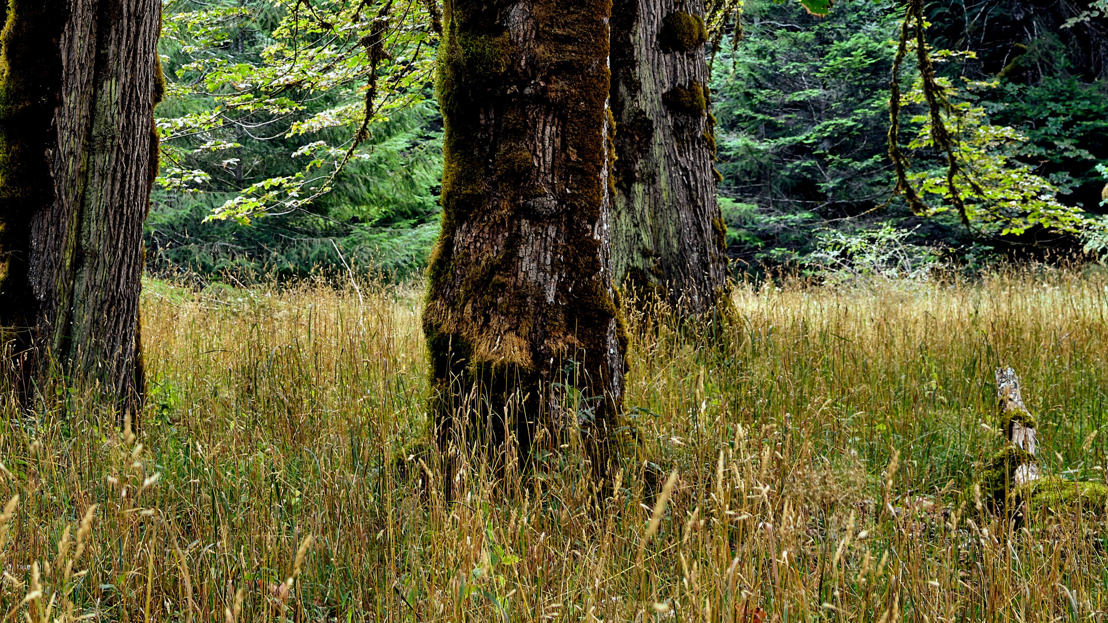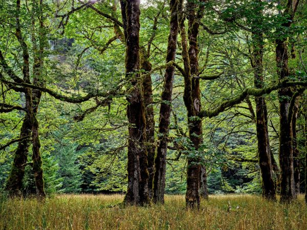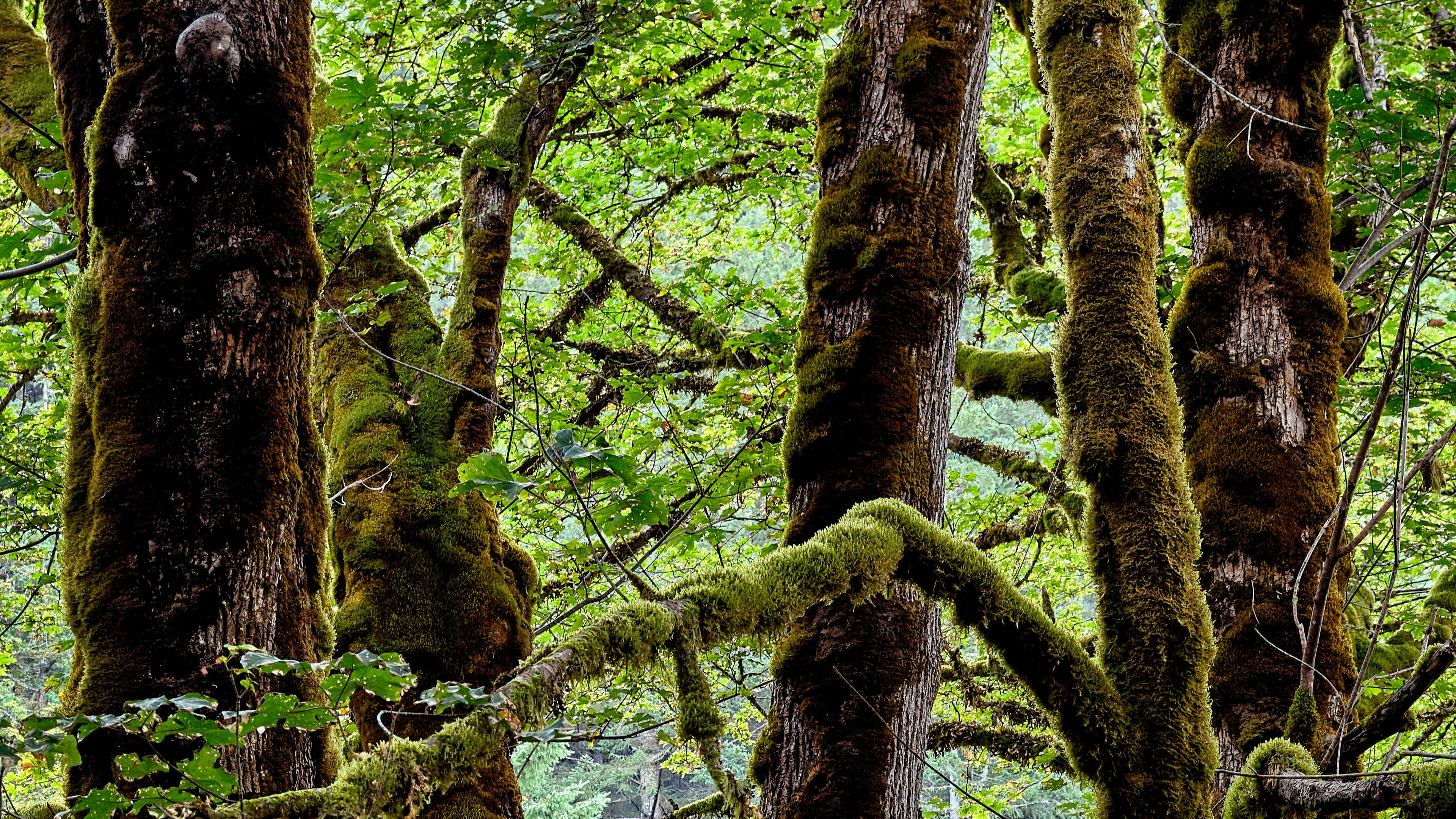 Vista sulla foresta con misteriosi alberi ricoperti di muschio