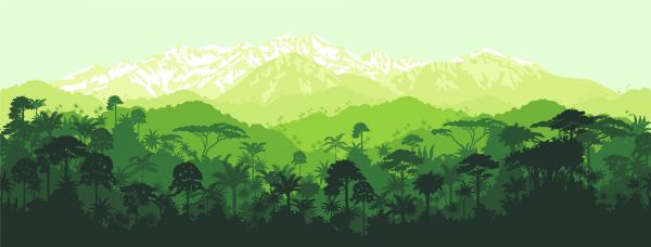 Illustrazione verde con alberi e piante. Sullo sfondo si vedono alte montagne innevate.
