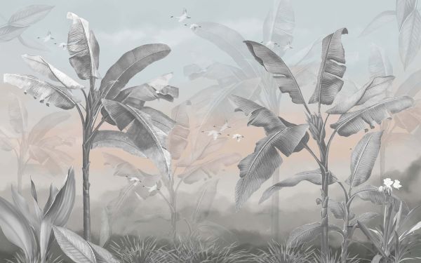 Questo sfondo fotografico con alberi tropicali in pista conferisce alla vostra stanza un aspetto unico. Osservate i cigni volanti e i fiori.