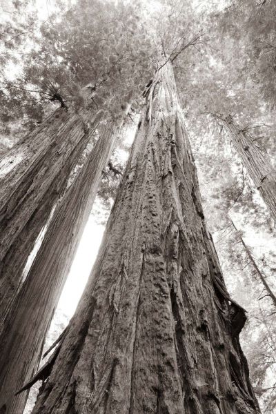 Un'immagine potente di alberi giganti impressionanti, catturata da un basso punto di vista in tonalità sepia e grigie morbide. Le linee verticali e le texture conferiscono un senso di altezza, silenzio e atemporalità.