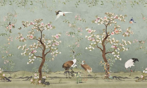 Un armonioso scenario ricco di eleganza naturale si svela in questo ricco design, in cui alberi fioriti graziosi e gru graziose sono i protagonisti. Lo sfondo è realizzato in una delicata tonalità di verde giada con una sottile texture che evoca l'atmosfera di un muro di seta dipinto. I fiori variano dal bianco crema al rosa cipria e al rosa antico, mentre i rami si piegano elegantemente sopra un paesaggio rilassante. Tra i fiori volano uccelli canori e farfalle, conferendo all'insieme un carattere vivace ma equilibrato. Le gru, simboli di eleganza e armonia, aggiungono un elemento orientale e senza tempo all'insieme. Si muovono maestosamente tra cespugli fioriti, su un terreno che ricorda un giardino asiatico con dolci colline e fiori selvatici. Il design si adatta perfettamente a un interno classico, giapponese o romantico. Pensate a un ambiente con tonalità calde di legno, tessuti setosi e mobili raffinati dalle forme arrotondate. Anche all'interno di un interno moderno con tonalità neutre e linee minimaliste, questo design può creare un contrasto artistico e suggestivo. Molto adatto per l'uso in una camera da letto, un angolo lettura o un'elegante hall, dove la tranquillità e la bellezza si incontrano. Abbinatelo ad accessori in ottone, ceramica o bambù, e lavorate con tessuti nei colori naturali o con accenti rosa antico per rafforzare l'atmosfera morbida e raffinata. Mobili in legno chiaro o dettagli laccati neri possono entrambi creare una cornice adatta, a seconda dello stile desiderato.