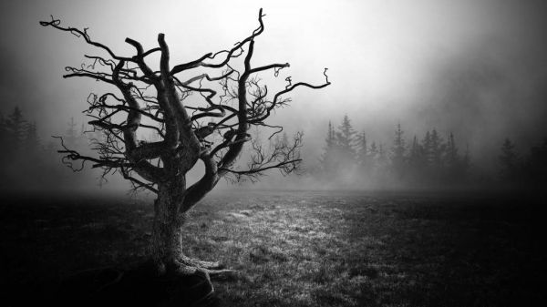 Carta da parati fotografica in bianco e nero con un elegante albero con rami contorti in primo piano e una foresta nella nebbia sullo sfondo.