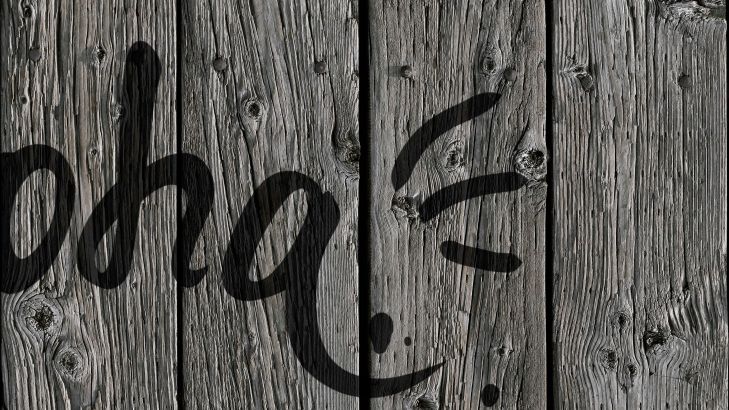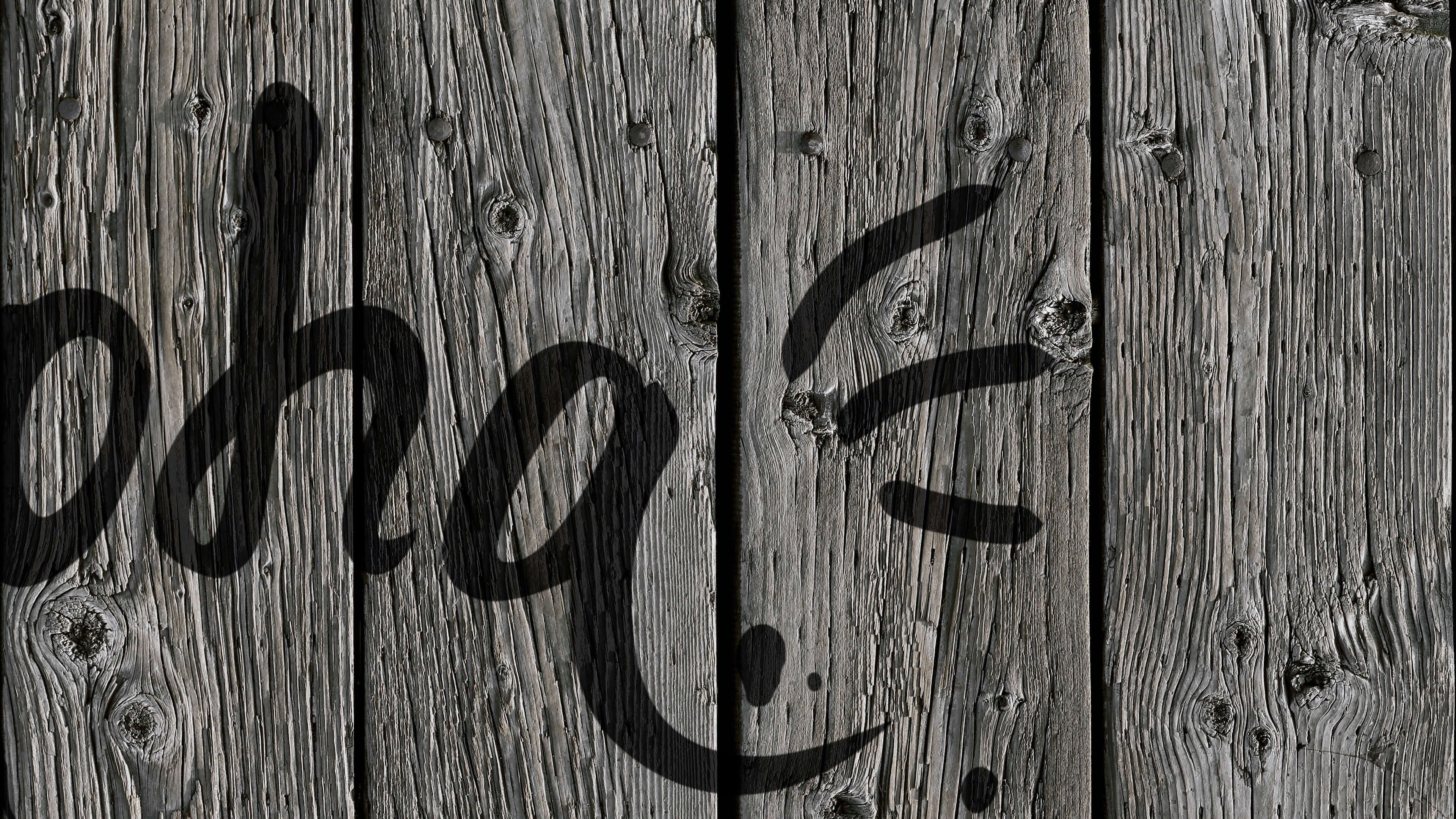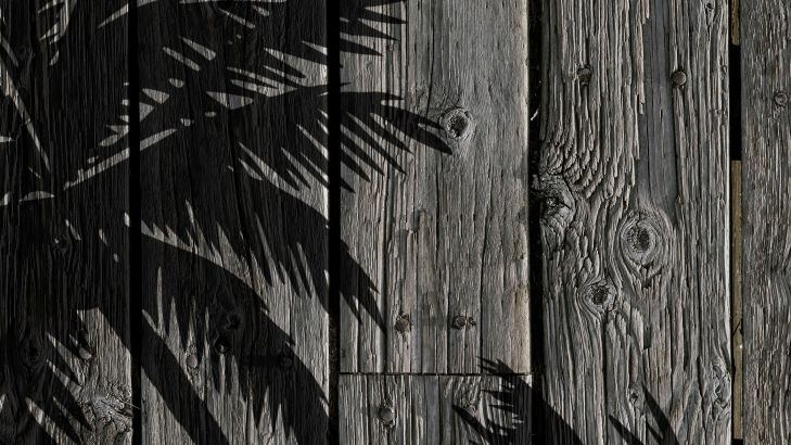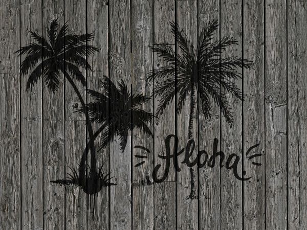 Tavole di legno stampate con palme e il testo "Aloha". A causa dei colori scuri, si può facilmente combinare questa carta da parati fotografica in quasi tutte le case.