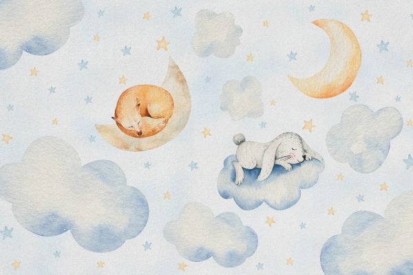 Due amici che dormono tra le nuvole. Questa adorabile carta da parati è perfetta per il vostro bambino e/o la vostra cameretta!