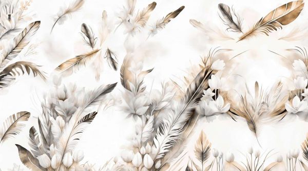 Un design suggestivo in cui piume eleganti e fiori delicati si uniscono in uno stile acquerello morbido. Le tonalità calde di oro, beige e crema conferiscono un aspetto elegante e rilassante. La composizione leggera e i tratti di pennello sottili creano un'atmosfera raffinata e senza tempo, perfetta per un'ambiente sereno.