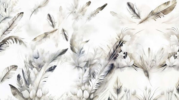 Un design sottile ed elegante con piume fluttuanti e fiori delicati in morbida tecnica acquerello. Le tonalità calde di beige, sabbia e crema creano un'atmosfera rilassante, mentre le sottili pennellate conferiscono un aspetto leggero e sognante. Perfetto per un'atmosfera serena e naturale.