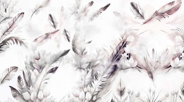 Un design elegante e raffinato in cui delicate piume e morbidi fiori si uniscono in uno stile acquerello. Le tonalità di taupe, lilla chiaro e grigio creano un'atmosfera calma e sognante. La composizione leggera e i tratti di pennello sottili conferiscono un aspetto luminoso ed elegante, perfetto per un'atmosfera serena.