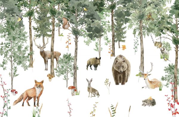 Una foresta ad acquerello con tutti i tipi di animali della foresta.