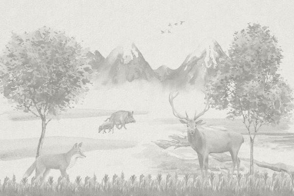 Una foto ad acquerello in morbide tonalità di grigio di diversi tipi di animali della foresta. La foto comprende, tra gli altri, un cervo, una volpe e due maiali.