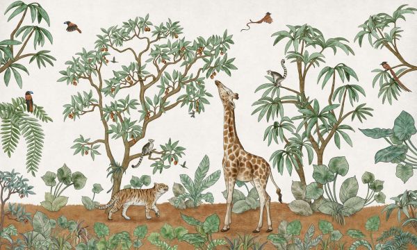Questo design raffinato ti immergerà in un mondo tropicale sereno, dove una graziosa giraffa è al centro di lussureggianti piante e alberi. L'illustrazione mostra un ambiente giungla tranquillo con tonalità verdi rilassanti, tonalità terrose di marrone e beige e uno sfondo delicatamente bianco che dona leggerezza visiva. Tra le foglie appaiono diversi animali: una tigre si muove furtivamente lungo il sottobosco, lemuri si bilanciano sui rami e uccelli esotici volteggiano tra gli alberi. Tutto è illustrato a mano in uno stile morbido e naturale che trasmette sia dettaglio che tranquillità. Questo design si adatta perfettamente a un interno botanico o scandinavo con accenti naturali. Pensate a mobili in legno chiaro, sedie in rattan o accessori in bambù, abbinati a tessuti di lino in colori sabbia o verde-grigio. Anche all'interno di un concept di camera per bambini naturale, questo design unisce armonia e scoperta: stimola la fantasia e porta una tavolozza di colori rilassante nello spazio. Grazie alla disposizione ordinata delle linee orizzontali e alla composizione aperta, questo design è adatto per superfici più ampie come una parete in una camera da letto, camera per bambini, angolo giochi o sala d'attesa. Grazie ai colori tenui e all'assenza di motivi troppo elaborati, risulta visivamente calmo e versatile, senza perdere il suo fascino. La combinazione di flora e fauna crea una storia decorativa che invita a guardare, nominare e scoprire - ideale per ambienti che accolgono sia la tranquillità che la curiosità.