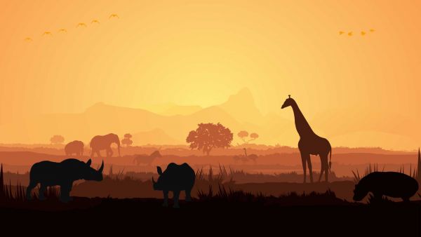 Animali selvatici nella savana con un sole arancione sullo sfondo.