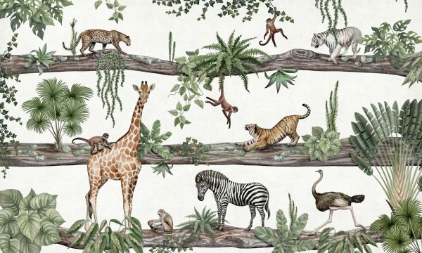 Una giungla vivace piena di animali esotici come tigri, scimmie, giraffe e zebre, circondata da foglie tropicali e liane. Le tonalità verdi naturali e i caldi toni marroni e ocra creano una sensazione giocosa e avventurosa, con un ricco contrasto su sfondo chiaro.