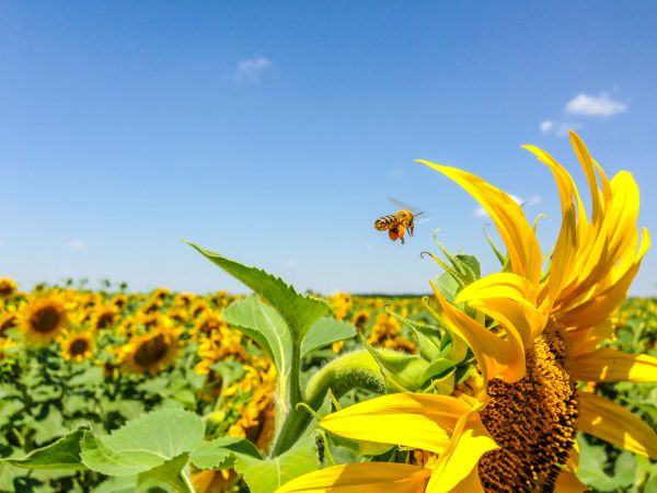 Una bella immagine di un'ape volante piena di polline vicino a un campo di girasoli gialli.