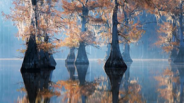 Carta da parati fotografica di un lago con alberi. Tra gli alberi, una leggera nebbia si staglia sull'acqua rendendo questa foto misteriosa.