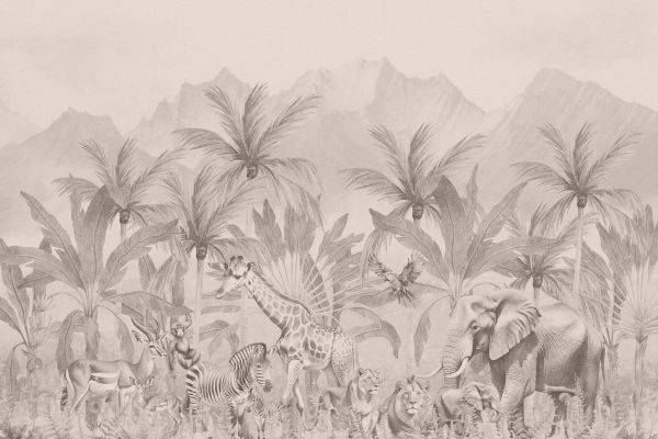 Scendete in un paesaggio sereno dove l'essenza della savana africana prende vita. Gli animali finemente raffigurati, dal nobile elefante alla maestosa giraffa, sono raffigurati su uno sfondo di sottili foglie di palma e sagome di montagna, il tutto in armoniose sfumature di grigio.