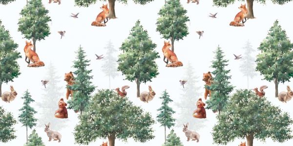 Animali della foresta giocosi, tra cui volpi, orsi e conigli, sono sparsi tra pini verdi e uccelli fluttuanti in questa scena vivace. La tecnica ad acquerello morbida conferisce una qualità da sogno al design, con ogni animale che contribuisce a un senso di comunità e gioia naturale.