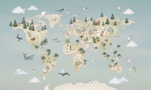 Questa delicata illustrazione mostra una mappa del mondo dettagliata in cui ogni continente è popolato da animali caratteristici provenienti da ambienti diversi. Dalle giraffe e elefanti in Africa agli orsi e cervi in Europa e in Nord America, e dai panda in Asia ai canguri in Australia. Intorno ai continenti nuotano balene e delfini in un oceano calmo azzurro-verdognolo, mentre nuvole e uccelli conferiscono all’insieme un’atmosfera leggera e onirica. L’uso dei colori consiste in tonalità pastello tenui come verde salvia, beige caldo e azzurro chiaro, che garantiscono un aspetto armonioso e tranquillo. In un interno scandinavo questa carta forma un elemento di richiamo discreto, soprattutto in combinazione con mobili in legno chiaro, forme minimaliste e materiali naturali come lino e cotone. Pensa a una scrivania per bambini in legno di betulla, un tappeto in tonalità terrose tenui e accessori in verde menta o sabbia. All’interno di un interno moderno e giocoso il design può essere invece combinato con mobili più lineari, forme rotonde e accenti colorati come cuscini giallo ocra o cestini in terracotta, creando un’atmosfera vivace ma equilibrata. Le delicate trame di alberi, montagne e onde oceaniche aggiungono profondità e struttura all’immagine senza apparire opprimenti. Per questo è particolarmente adatta per una camera dei bambini, uno spazio gioco o un angolo creativo dove sono desiderate sia tranquillità sia ispirazione. Anche in uno studio o in una zona lettura questa illustrazione può contribuire a creare un’atmosfera curiosa e di scoperta. Scegliendo accessori che richiamano la natura e i viaggi, come figure in legno di animali o un globo, si enfatizza ulteriormente il carattere cosmopolita.
