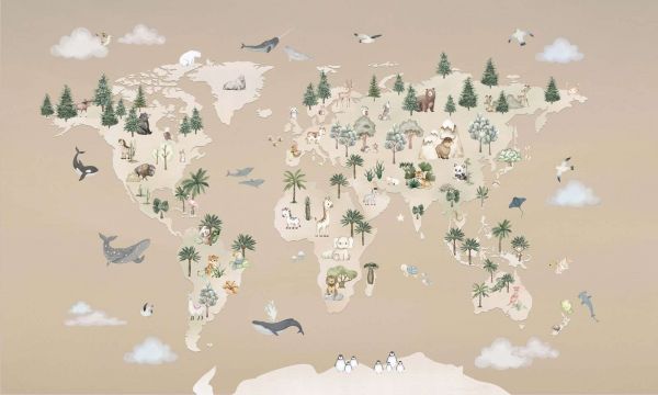 Una raffinata mappa del mondo in calde tonalità sabbia con dolci animali sparsi sui continenti e negli oceani. Palme, pini, nuvoletti e elementi marini morbidi creano un insieme giocoso ma tranquillo, con un aspetto naturale e amichevole.