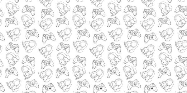 Un design di gioco elegante e minimalista con un motivo di controller di gioco e cuffie disegnati a mano. I disegni a linea monocromatica su uno sfondo chiaro creano un aspetto sottile, moderno e giocoso, perfetto per una stanza da gioco con un look pulito e contemporaneo.