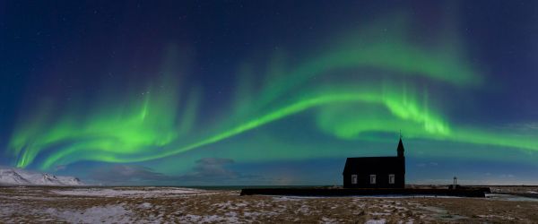 Aurora boreale sopra una chiesa in diversi materiali