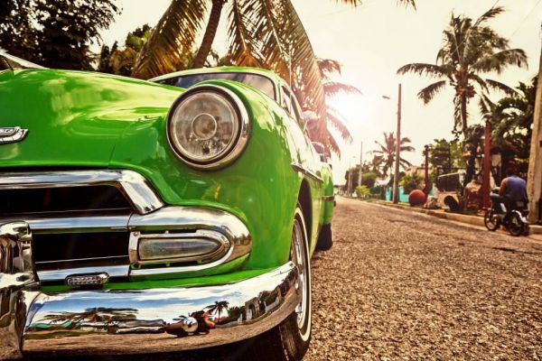 Carta da parati con una classica auto verde su uno sfondo con una strada soleggiata e palme