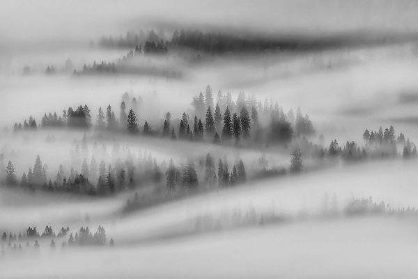 Un'immagine nebbiosa in bianco e nero con alberi. Da abbinare al soggiorno o alla camera da letto.