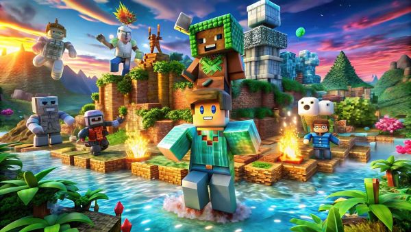 Un mondo fantastico colorato in stile blocco pieno di personaggi e avventure. L'acqua scintillante, i fuochi da campo ardenti e il chiaro tramonto creano un'atmosfera vivace. I personaggi, in abiti appariscenti, navigano attraverso un paesaggio pieno di verde, montagne e edifici di blocchi lucenti.