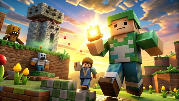 Un dinamico pixelato paesaggio al tramonto. Due personaggi colorati si trovano in un paesaggio fiorito pieno di fiori, strutture di pietra e una torre medievale. Il caldo bagliore del tramonto crea un'atmosfera avventurosa ed energica.