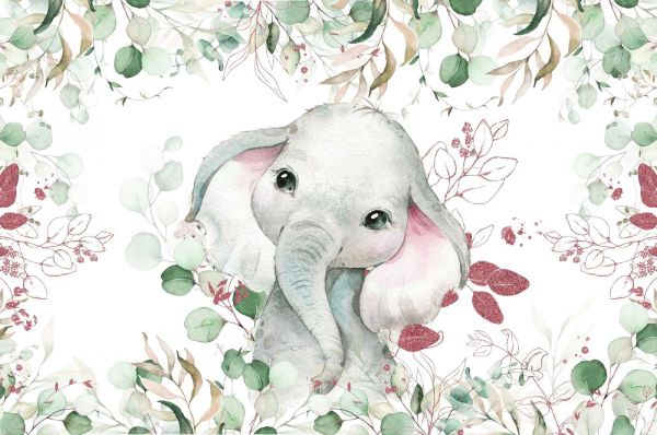 Carta da parati - Baby elefante con foglie di menta e rosa