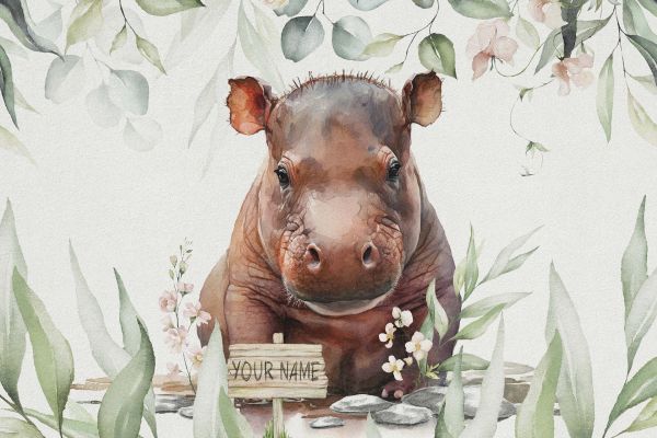 Un simpatico cucciolo di ippopotamo tra le foglie. Disponibile anche con il nome del bambino!