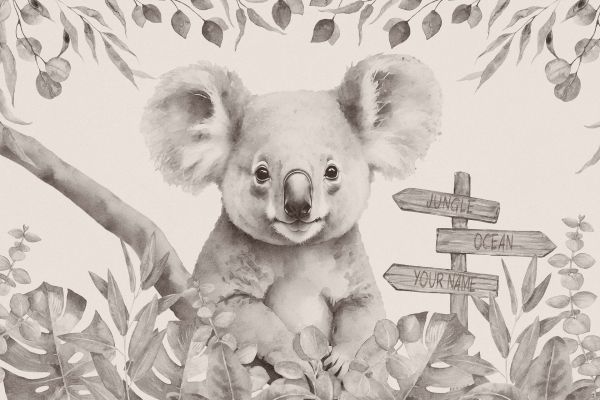 Un koala si aggira in un regno armonioso di monocromia, circondato da un labirinto di foglie e sottili segnali. Il disegno invita a un momento di riflessione all'interno di un sereno rifugio naturale.