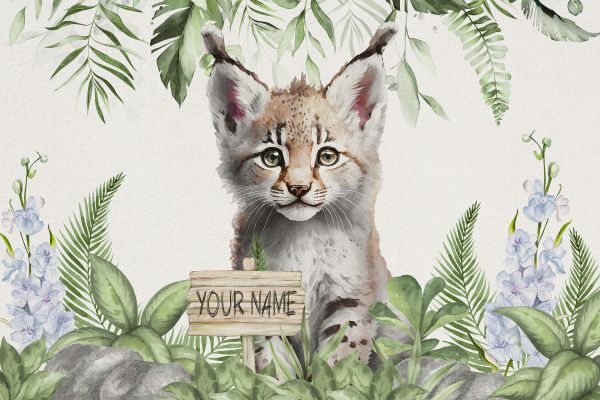 In questa immagine, una giovane lince con occhi attenti e curiosi e i caratteristici ciuffi sulle orecchie attira l'attenzione. Circondata da un morbido letto di fiori e dal verde della natura, la lince emana un'eleganza selvaggia. I colori tenui e il disegno dettagliato la rendono incantevole.