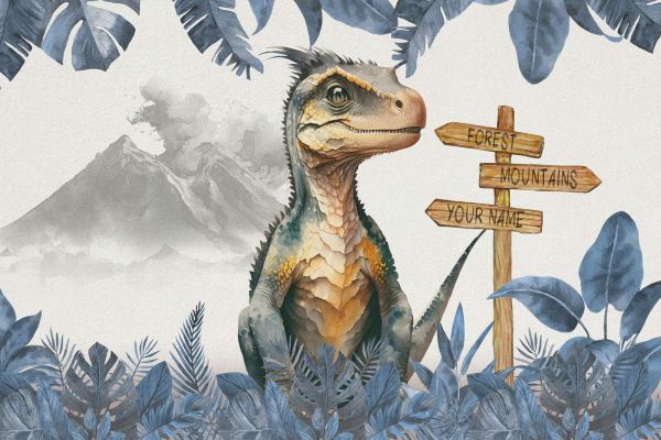 Un cucciolo di velociraptor nella giungla blu. Disponibile anche con il nome del tuo bambino!