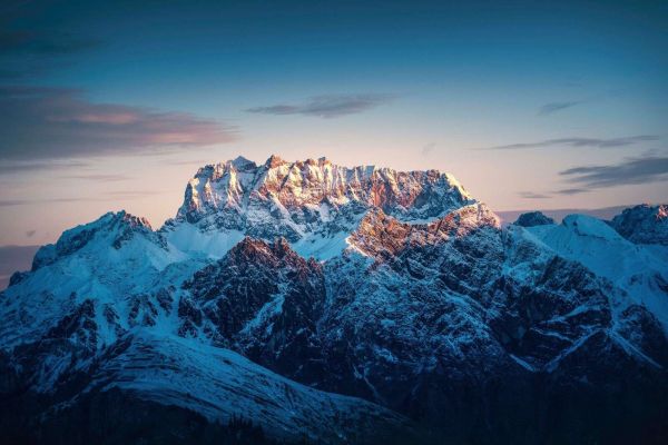 Questo design mostra una maestosa catena montuosa appena dopo il tramonto, dove l'ultima luce avvolge le cime innevate in una calda e ramea luminosità. Il primo piano è immerso in tonalità blu fresche, che contrastano con i toni arancioni e rosa infuocati sulle creste montuose. La struttura della roccia è nitidamente visibile, con ombre profonde e contorni drammatici che conferiscono profondità e potenza all'immagine. Il cielo sfuma delicatamente dal rosa pastello chiaro a un crepuscolo blu brillante, creando un'atmosfera di pace e monumentalità. In un interno classico, questa immagine aggiunge un senso di bellezza senza tempo e grandiosità. Immagina uno spazio con pavimenti in legno, accenti blu scuro o bordeaux e accessori dorati. Il design si adatta particolarmente bene a uno stile alpino o chalet, dove rafforza gli elementi naturali di legno, lana e pietra con la sua ruvida e montuosa presenza. La combinazione di colori blu ghiaccio, viola tenue, grigio pietra e arancione chiaro offre molte possibilità di stile. Abbinare con tessuti in velluto o lana, mobili in quercia scura e accessori in bronzo o metallo nero opaco. Immagina una stanza con una poltrona in pelle, una coperta di lana grossolana e un camino in pietra come contrasti caldi all'immagine. Questo design è ideale per spazi che devono trasmettere un senso di potenza, calma e bellezza naturale, come un soggiorno, uno studio o un ingresso moderno. La struttura orizzontale conferisce una sensazione di ampiezza e stabilità in ogni ambiente. L'immagine respira il mistero delle montagne al crepuscolo e invita al silenzio e alla meraviglia.