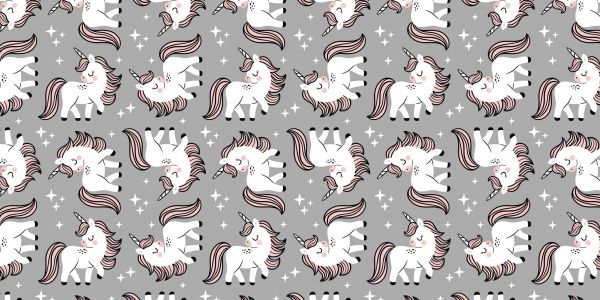 Un motivo di unicorni bianchi con criniere rosa su uno sfondo grigio.