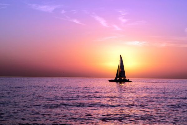 Belle sagome di una barca a vela durante un tramonto di colore viola.