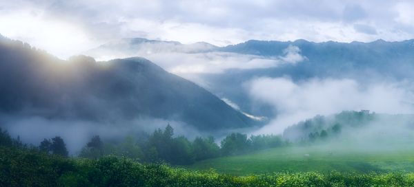 Una bella vista panoramica di una catena montuosa nella nebbia.