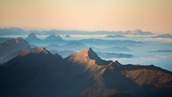 Una cresta montuosa illuminata chiaramente si staglia contro un paesaggio ondulato di nebbia e ombra. Le tonalità pastello delicate del cielo mattutino e le linee montane stratificate creano un panorama tranquillo e sognante ricco di profondità e atmosfera.