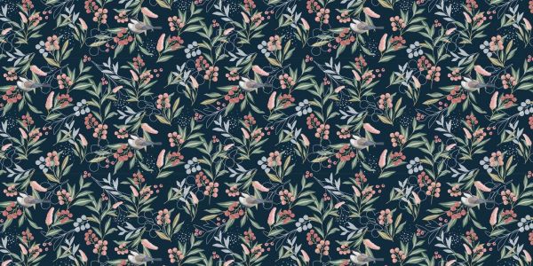 Una composizione atmosferica dove vivaci cinciarelle si annidano tra foglie verdi e una moltitudine di bacche. Il design gioca con i contrasti, con lo sfondo blu notte che esalta la tavolozza dei colori di toni rosa speziati e sfumature di verde morbido. Le cinciarelle portano vita e movimento alla scena, mentre le bacche e i fiori suggeriscono un senso di abbondanza e fertilità. Questo design è una celebrazione del mondo naturale in una veste elegante.