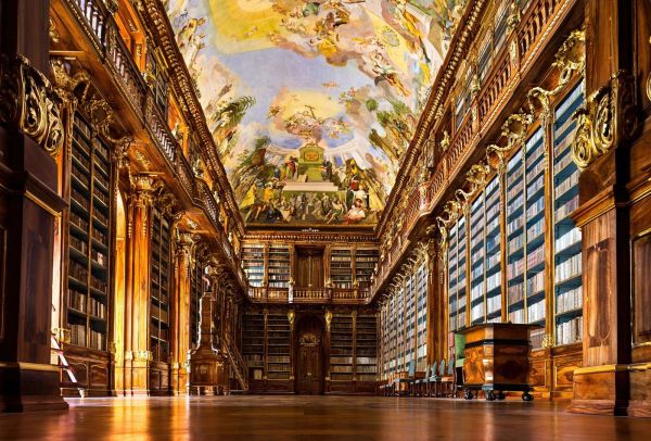 Un design maestoso in cui la magnificenza di una biblioteca barocca è al centro. Le riccamente decorate librerie in legno con dettagli dorati e il maestoso affresco del soffitto creano un'atmosfera lussureggiante e senza tempo. Le calde tonalità del legno e l'artigianato dettagliato conferiscono un aspetto classico e lussuoso.